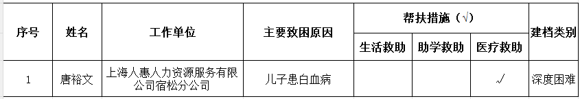 根据《安徽省工会困难职工建档帮扶实施细则》规定,经职工本人申请、基层工会初审、帮扶中心审核、县总工会主席办公会研究决定,拟对以下1名困难职工进行建档帮扶,现将名单进行公示,公示期为2026年1月4日--2026年1月8日,接受社会监督。