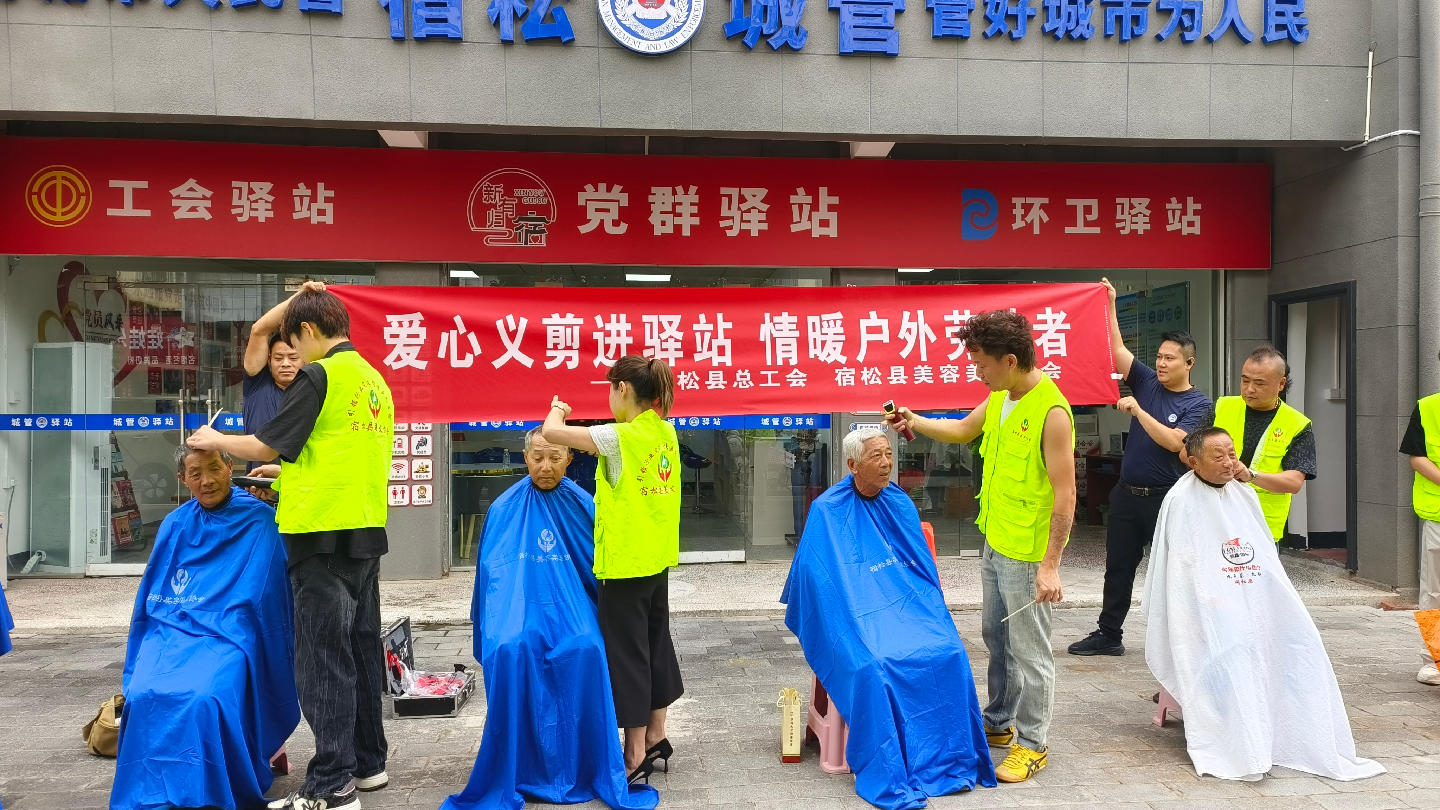 一把剪刀,传递温暖;一份关怀,情满驿站。7月22日,宿松县总工会联合县美容美发工会在宿松城管(工会驿站)开展爱心义剪活动,现场为20余名“城市美容师”提供免费理发服务,用实际行动诠释工会组织对户外工作者的关爱与尊重。