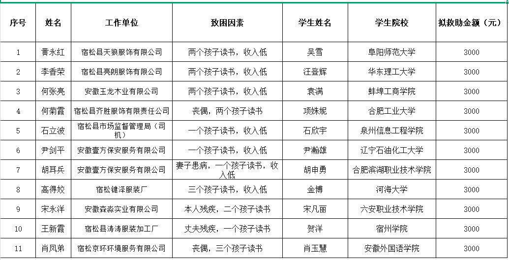 根据安徽省总工会《关于印发<2025年全省工会金秋助学活动工作方案>的通知》(皖工【2025】61号)和《关于下拨2025年金秋助学活动资金的通知》,黄永红等11名职工(名单附后)经职工本人申请、基层工会初审、帮扶中心审核、县总工会主席办公会研究等,符合省总经费金秋助学条件,现予公示,公示期为2025年9月19日--2025年9月25日,接受社会监督。