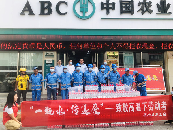 “您的付出,我们在乎”。宿松县总工会党组成员、副主席唐文洁表示:高温工作者无畏“烤”验、默默奉献,是保障宿松正常运转的重要力量之一,值得每个人关注和关爱。此次活动,不仅仅是一个口号,更是对高温工作者在烈日下坚守岗位的关爱和致敬,希望通过此次活动,帮助高温工作者缓解身体和精神的疲惫,同时希望有更多的爱心企业、爱心人士参与到我们的活动中来,让爱传递,营造劳动最美丽、劳动最伟大、劳动最光荣的浓厚氛围。(胡淑芬)