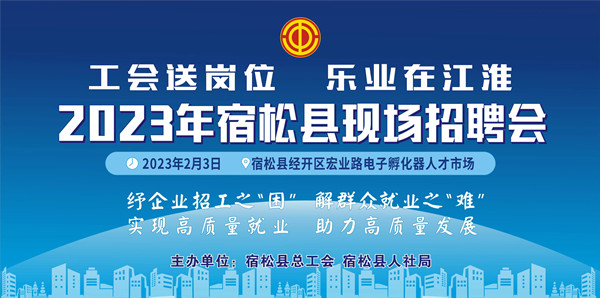 为深入学习贯彻党的二十大精神,落实省委省政府发扬自我革命精神坚持严的基调持续深化“一改两为”全面提升工作效能大会和省总工会2023年“工会送岗位 乐业在江淮”全省工会就业援助行动部署会精神,根据省总工会统一安排,举办宿松县2023年“工会送岗位 乐业在江淮”大型现场招聘会,欢迎各用人单位和广大求职人员踊跃参加。