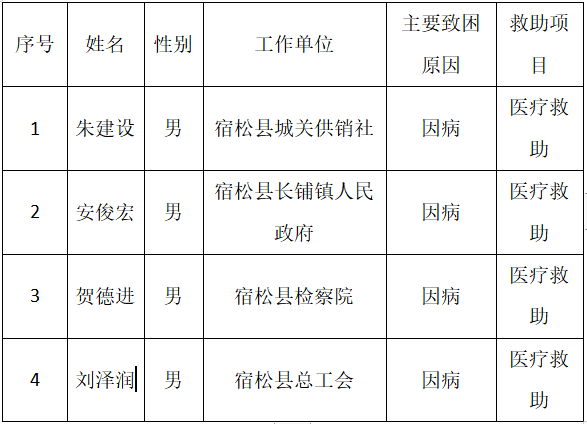 经职工本人申请、基层工会初审、帮扶中心审核、县总工会主席办公会研究决定,拟对以下4名困难职工进行帮扶。现将名单进行公示,接受社会监督。