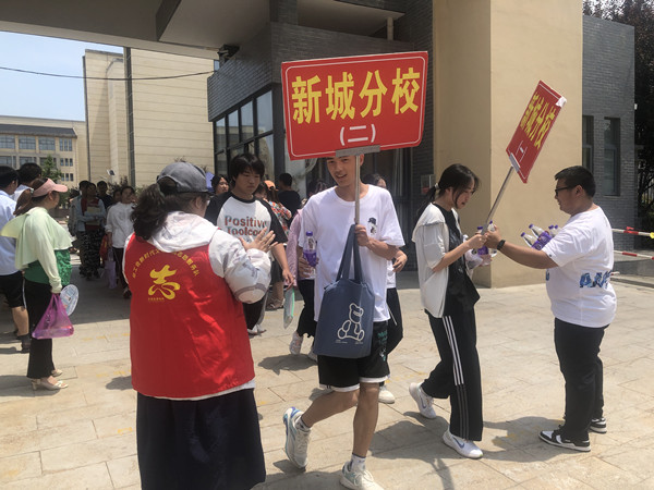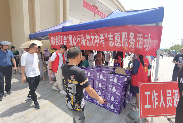 早上7时,县总工会新时代文明实践站的志愿者已经在实验中学新城分校中考考点,拉起“爱心行动·助力中考”志愿服务活动条幅,搭起爱心助考点,为考生和家长做好后勤保障工作,送上一份夏日的清凉。